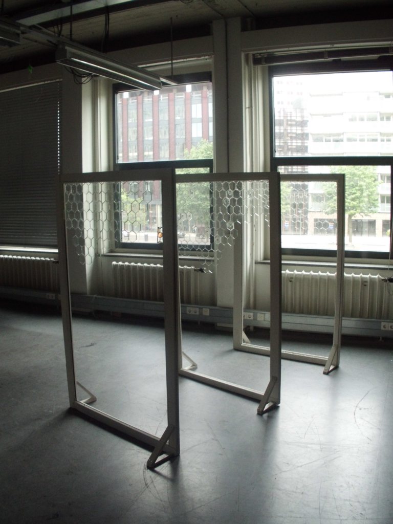 A series of hive sculptures made in window frames with glass hexagons that include real bees (collected not killed) fused into the glass. The connecting glue is coated with sugar, to invite live bees to complete the tessellation and seal the hive in the frame.
